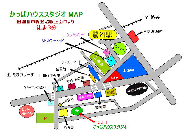 周辺地図 かっぱハウススタジオ 〒216-0004 神奈川県川崎市宮前区鷺沼1-17-8ハイツ鷺沼B1 Office TEL.045-978-3857 Mail. kappa@muf.biglobe.ne.jp アクセス 電車の場合 田園都市線鷺沼駅正面口を出て徒歩約3分 自転車 オートバイ お車出お越しの場合 駐車場はございませんので、お近くのパーキング、時間貸し駐輪所にお止め下さい。